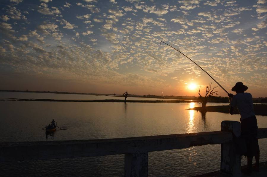 恬靜的緬甸曼德勒烏本橋夕照漁舟 世界上最古老、最長的柚木橋-烏本橋位於緬甸曼德拉市郊;烏本橋夕陽中,她的樹、舟、人,皆成美景。烏本橋非常重要的特色,就是黃昏時的僧人遊走在橋上或坐在橋墩上,禪念看著夕陽。